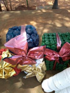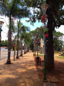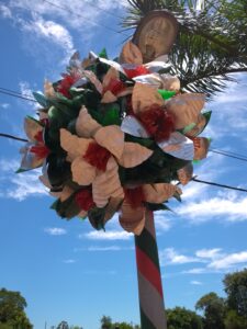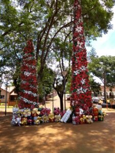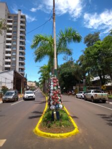 Así lo hizo la administración de Puerto Iguazú embelleciendo la ciudad con pinos de colores, cajas de regalos y arreglos florales hechos con botellas de plástico pintadas.