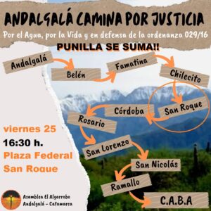 Hace unos días, vecinas y vecinos del pueblo de Andalgalá emprendieron una caminata a la Ciudad de Buenos Aires para defender la ORDENANZA Municipal 029/16 que prohíbe la megaminería en los Nevados del Aconquija, que tanto el gobierno de la provincia de Catamarca como la empresa minera Yamana Gold y sus socios intentan hacer que se declare inconstitucional.