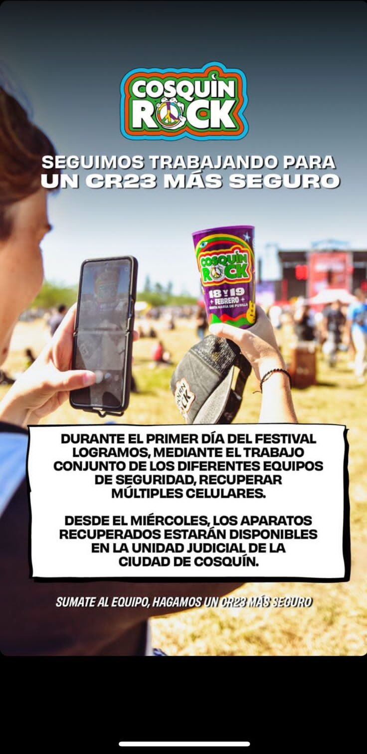 Una vez adentro, ya desde temprano, miles y miles de personas se desplazaban constantemente hacia todos lados, pero no se registró ningún disturbio ni incidente; todo está súper vigilado por una red de 59 cámaras de seguridad que observan absolutamente todo desde un centro de control comandado por personal de las fuerzas policiales, infantería, defensa civil, bomberos y staff de producción general. Según informes hubo algunas pérdidas de celulares, pero que han sido recuperados, y que serán devueltos a partir del miércoles 22 de febrero en la Unidad judicial de la ciudad de Cosquín, según lo anunciaron los organizadores.